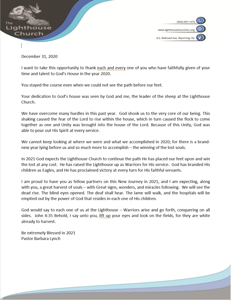 Because of the Unity… by Pastor Barbara Lynch Date December 31, 2020 Author Christopher Gore Category Blog, From the Desk of Evangelist Barbara Lynch Download this letter from Pastor Barbara LynchDownload